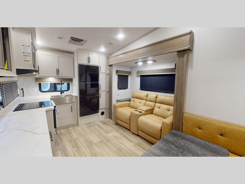 Sleeps 3 Slides 2 Length 31 ft 8 in Ext Height 11 ft 11 in Interior Color Bayport, Lexington Hitch Weight 1550 lbs Dry Weight 8344 lbs Cargo Capacity 1256 lbs Fresh Water Capacity 44 gals Grey Water Capacity 78 gals Black Water Capacity 39 gals Furnace BTU 30000 btu Available Beds King Refrigerator Type 12V Refrigerator Size 10 cu ft Cooktop Burners 3 Number of Awnings 2 LP Tank Capacity 30 lbs Water Heater Type Tankless Awning Info 18' Power with LED Lights Axle Count 2 Washer/Dryer Available Yes Number of LP Tanks 2 Shower Type Walk-In Shower Electrical Service 50 amp Similar Floorplans